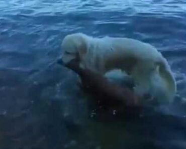 Пес спас олененка из воды